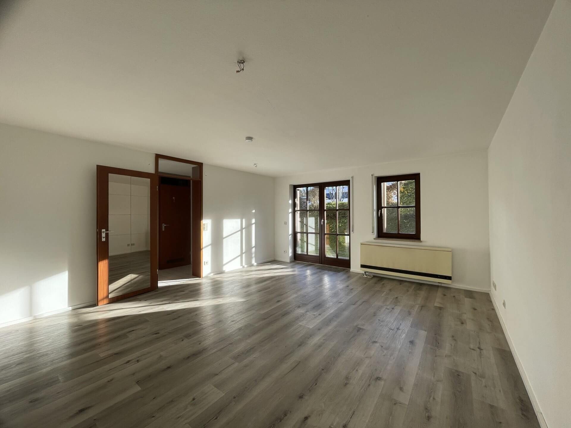 Die Wohnung liegt im Souterrain eines Mehrfamilienhauses und überzeugt durch helle Räume und einen durchdachten Grundriss. Der großzügige Wohn- und Schlafbereich bietet vielfältige Einrichtungsmöglichkeiten und verfügt über große Fenster sowie eine Terrassentür mit direktem Zugang zur Terrasse und dem angrenzenden Garten.
